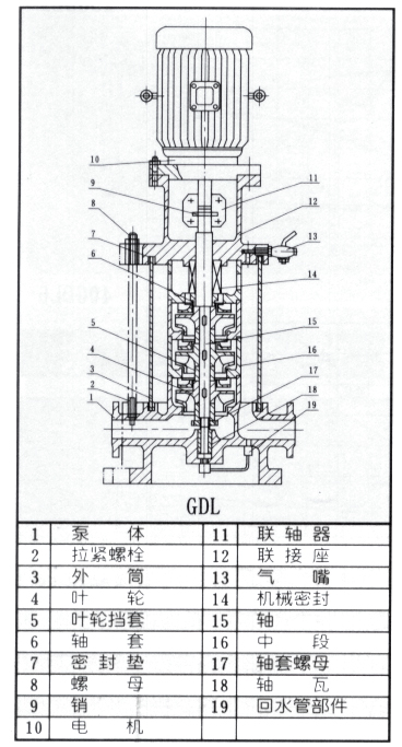 GDL立式多級離心泵其吸入、排出口分別位于同一直線上。轉子部件由軸、葉輪、葉輪擋套、軸套等零件組成,進水段、中段、出水段用拉緊螺栓聯結。軸封采用機械密封,用平衡室的壓力水進行潤滑和冷卻。產品執行JB/T2727-93《立式多級筒型離心泵 型式與基本參數》標準。